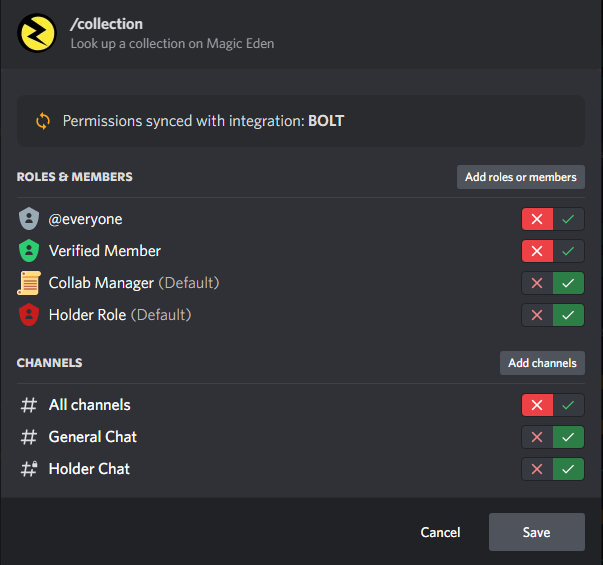 In the image below, **Holder Role** has been checked and **Verified Member** has been disabled. This was used to showcase how you would set it up if you wanted only have **Holders** to be able to use **BOLT**:zap: commands.\