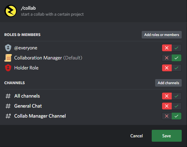 In the image below, **Holder Role** has been disabled and **Collaboration Manger** role has been enabled. There has also been a **Collaboration Manager Channel** created by the project owner so that these individuals can use the commands in this server.\
